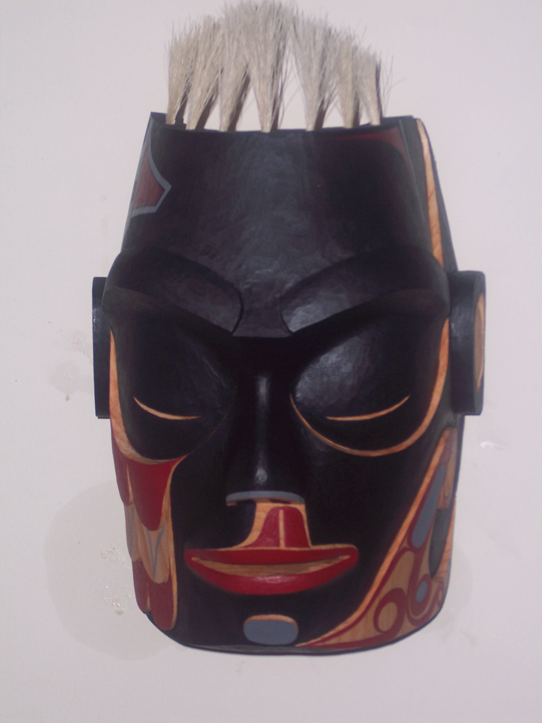 At any rate, these mixed influences may explain the mixture found on “Ancestor of Today.” On the one hand, the mask includes elements that are universal in the coastal traditions, including the U-shapes and the labret that indicates high status. The hair, too, is arranged in a buzz-cut that I have seen in works from every nation.