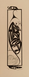 Luke Marston is a Coast Salish artist whose work is much in demand. In the summer of 2009, he and his brother John had an exhibit at the Inuit Gallery that must have set records for the prices obtained by artists in their mid-careers. Since then, neither has sustained those prices, but each continues to be much sought-after (Luke, for the record, is the brother who does the astonishing masks and historical recreations). Never having had the money when I saw one of his works that I admired, I was glad to pick up a remarque of his print “Family.”